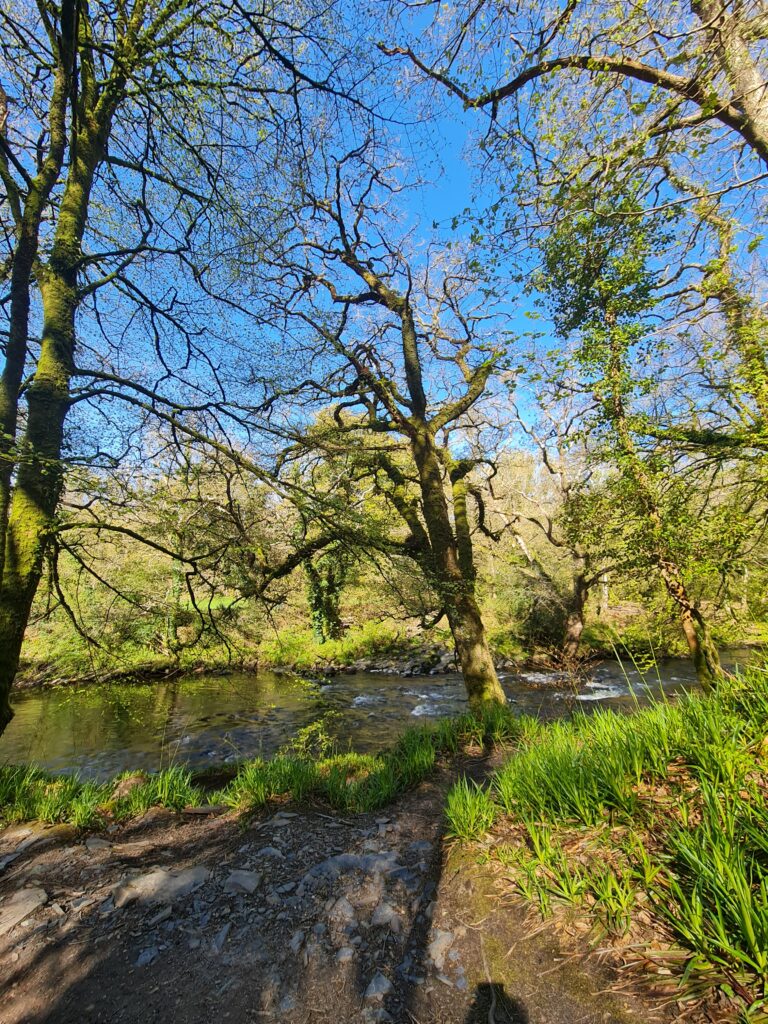 A small group walking together through the forest beside a river, symbolising the journey of coaching vs therapy — growth, reflection, and connection in nature.spring sunlight.